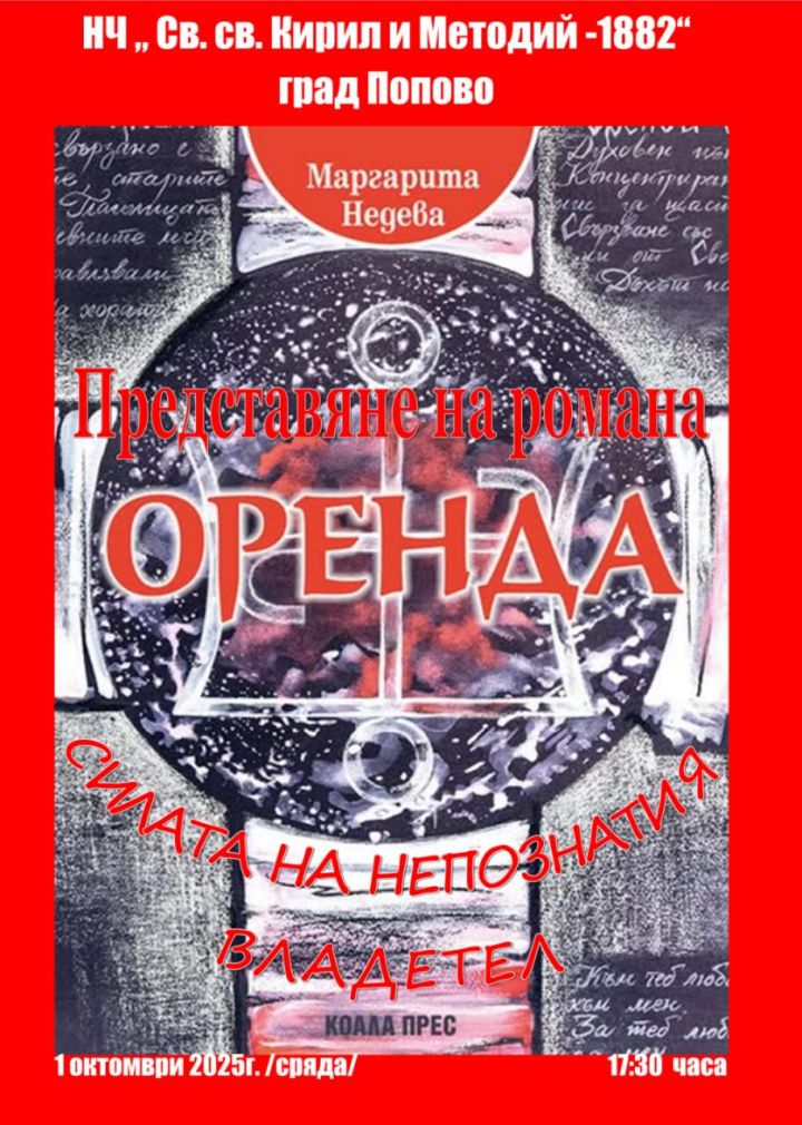 Новият роман на Маргарита Недева, библиотекар в Градска читалищна библиотека при Народно читалище „Св. св. Кирил и Методий 1882“ – град Попово ще бъде представен в читалищния салон на първи октомври 2025г. от 17:30 часа.