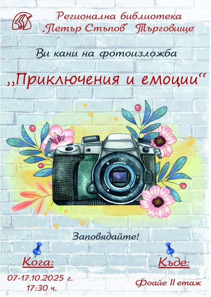Регионална библиотека „Петър Стъпов“ кани на фотоизложба „Приключения и емоции“, дело на учениците от 7 „а“ клас при Първо основно училище „Христо Ботев“ гр. Търговище.