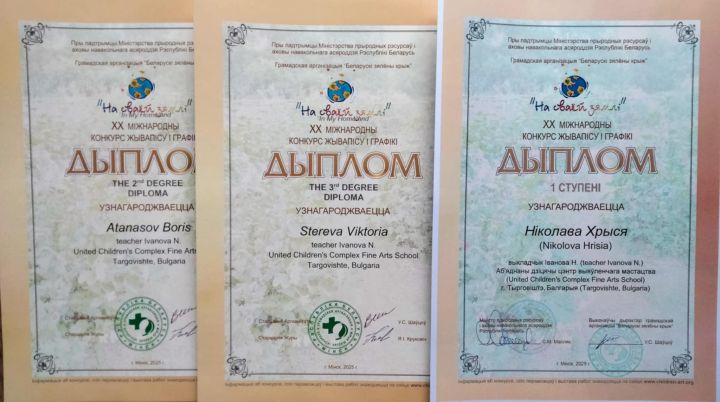 Диплом първа, втора и трета степен от XX Международен конкурс „В моята родина“, Република Беларус са присъдени на трима малки възпитаници на Нора Иванова.
