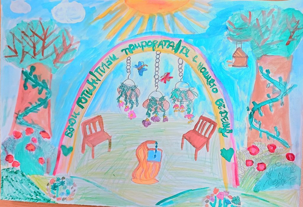 В градинското пространство вече са засадени храсти, които ще образуват жив плет. Поставени са пейки и арка с надпис „Бъди готин! Пази природата! Тя е нашето бъдеще!“ – посланието, което Данислава отправя с рисунката си. Ще бъдат засадени и две ясенови дървета, изобразени в проекта на детето.