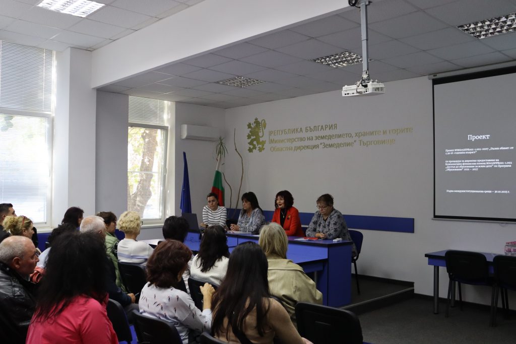 На 30 октомври 2025 г. в конферентната зала на Областна дирекция „Земеделие“ Търговище се проведе първата междуинституционална среща по проект BG05SFPR001-1.002-0007 „Пълен обхват: от 4 до 16-годишна възраст“, реализиран по процедура BG05SFPR001-1.002 „Достъп до образование за всяко дете“ по Програма „Образование“ 2021 – 2027.