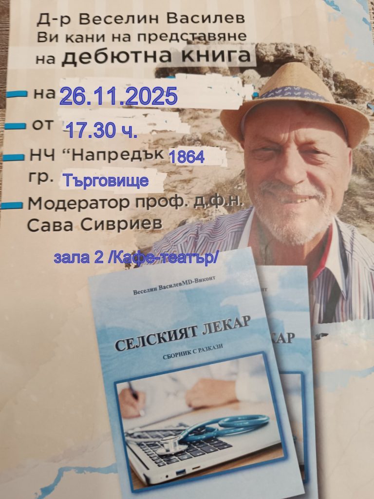На 26.11.2025 г. от 17.30 ч. в зала 2 – кафе-театър, читалище „Напредък“ – Търговище ще се състои представянето на дебютната книга с разкази на доктор Веселин Василев, „Селският лекар“.