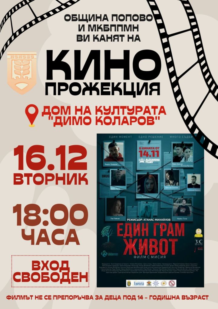Община Попово и Местната комисия за борба с противообществените прояви на малолетни и непълнолетни организират безплатна прожекция на филма „Един грам живот“ за родители и деца над 14 години. Целта на инициативата е повишаване на информираността относно рисковете от употребата на наркотични вещества, агресията и различните форми на насилие сред подрастващите.