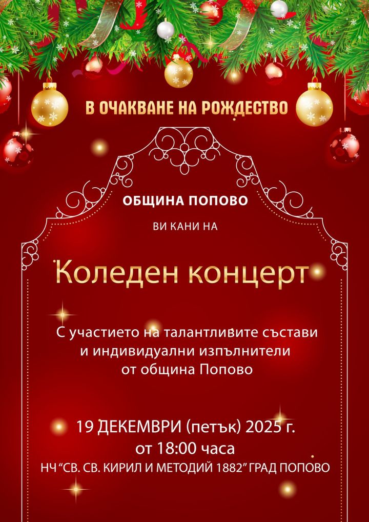 Община Попово организира Коледен концерт с участието на местни състави и индивидуални изпълнители. Събитието е част от инициативата „В очакване на Рождество“.