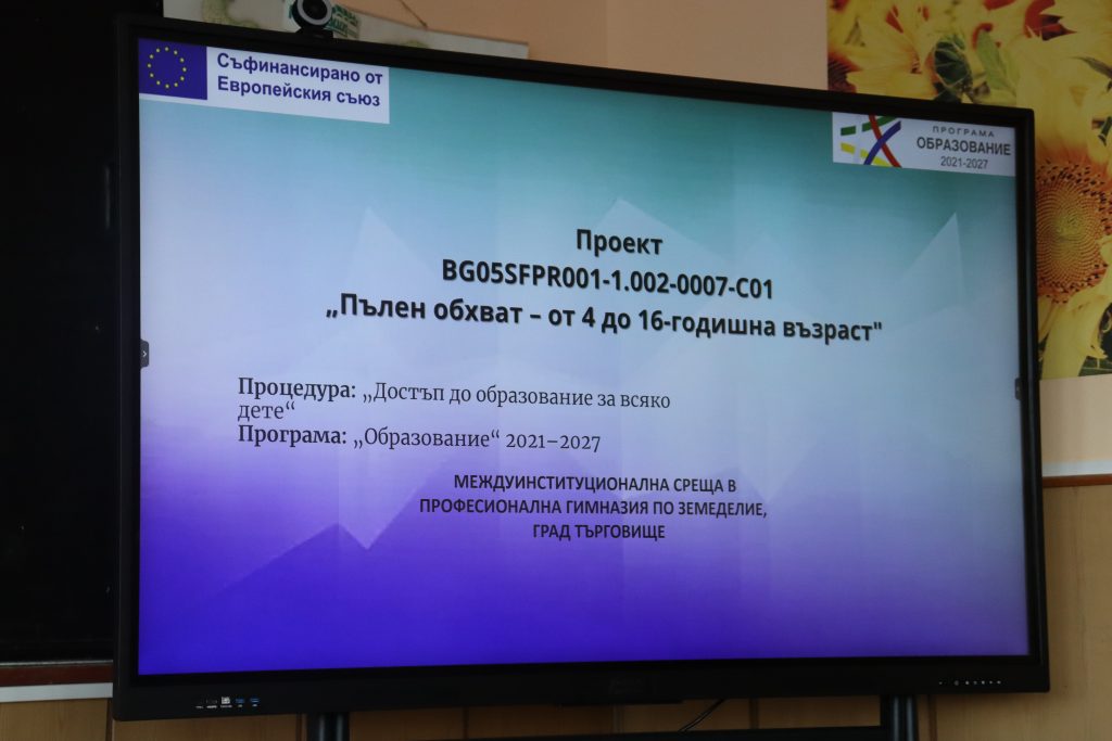 На 15 декември 2025 г. в Професионална гимназия по земеделие гр. Търговище се проведе Третата междуинституционална среща по проект BG05SFPR001-1.002-0007 „Пълен обхват: от 4 до 16-годишна възраст“. Срещата е част от дейностите по координация и обмен на информация в рамките на проекта, реализиран по процедура за директно предоставяне на безвъзмездна финансова помощ BG05SFPR001-1.002 „Достъп до образование за всяко дете“ по Програма ,,Образование“ 2021 – 2027.