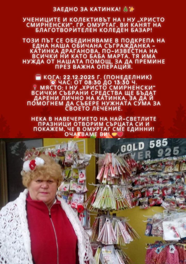 Учениците и колективът на I НУ „Христо Смирненски“ в гр. Омуртаг организираха благотворителен коледен базар на 22 декември 2025 г. Инициативата беше насочена към подпомагане на Катинка Драганова, известна като Баба Марта, която има нужда от средства за провеждане на важна медицинска операция.